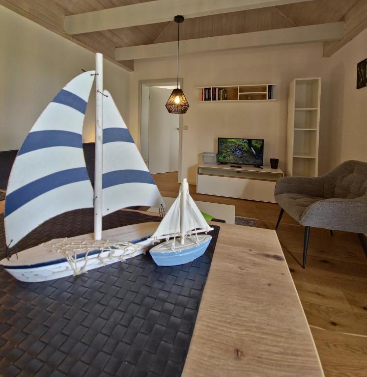 Die Kinder können in der Piratenhöhle unter dem Dach schlafen oder aber auf der Coach die mit einem Griff zum großen Schlafsofa umzunutzen ist.