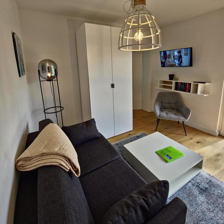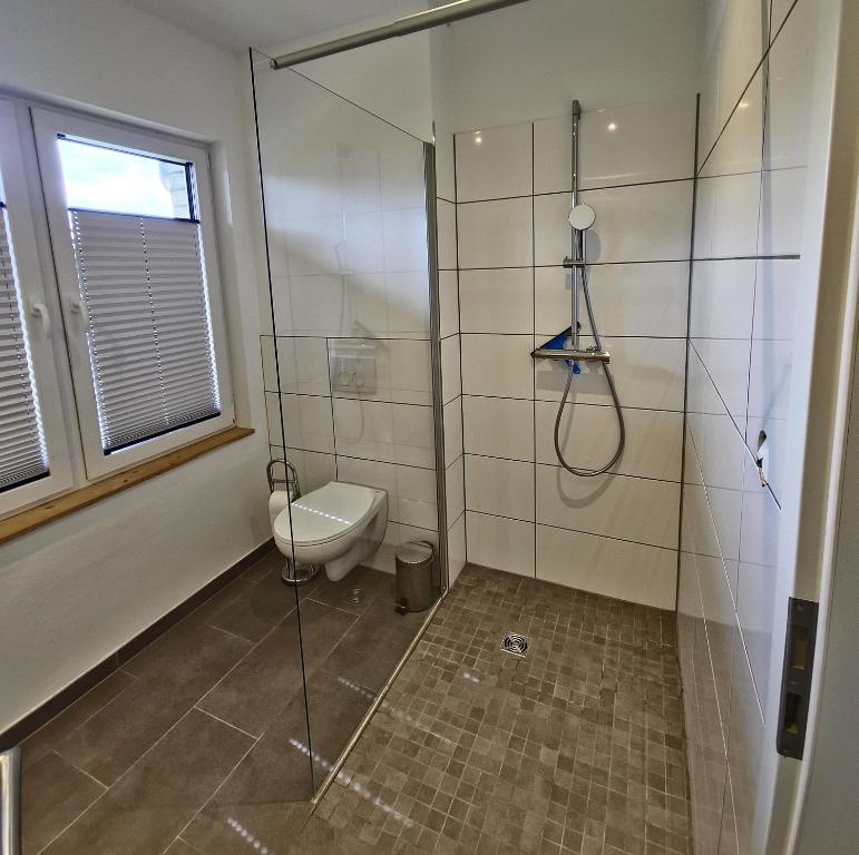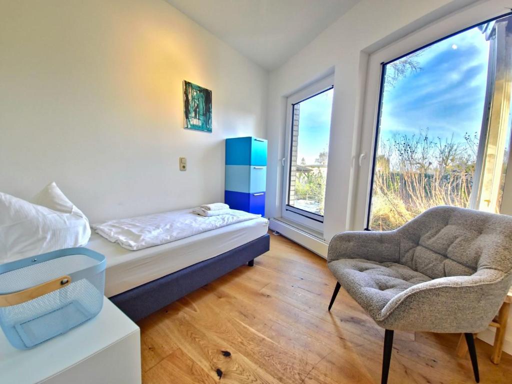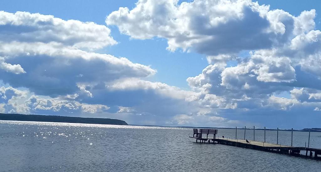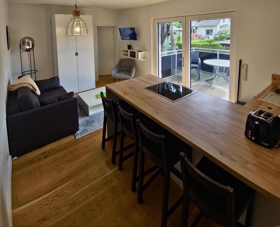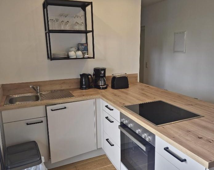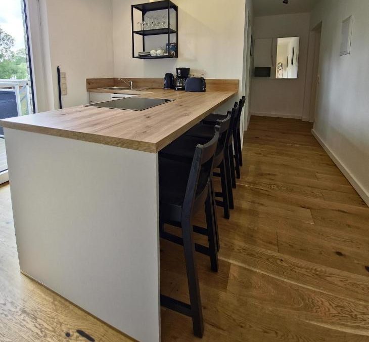 Auch diese Ferienwohnung verfügt über einen eigenen Eingang mit neuer Balkonterrasse im Erdgeschoss und bietet Ihnen von diesem eine Sicht auf das Achterwasser. Auch hier sind Hunde willkommen. Auch hier finden Sie neue Holzböden und eine moderne Küche.